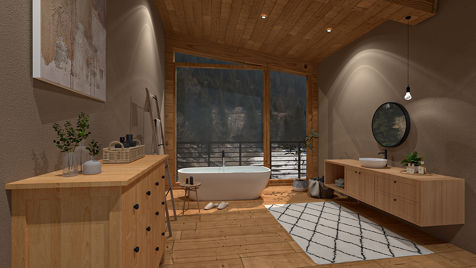 L’ambiente è dominato dal legno, utilizzato per pavimento, soffitto e arredi su misura, creando un’atmosfera calda e avvolgente. La vasca freestanding, posizionata frontalmente alla grande vetrata panoramica, diventa il fulcro della composizione, instaurando un dialogo diretto con il paesaggio esterno.