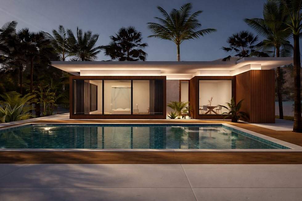 Visualizzazione 3D serale di una villetta moderna affacciata sul mare, progettata per valorizzare il dialogo tra architettura contemporanea e paesaggio tropicale.